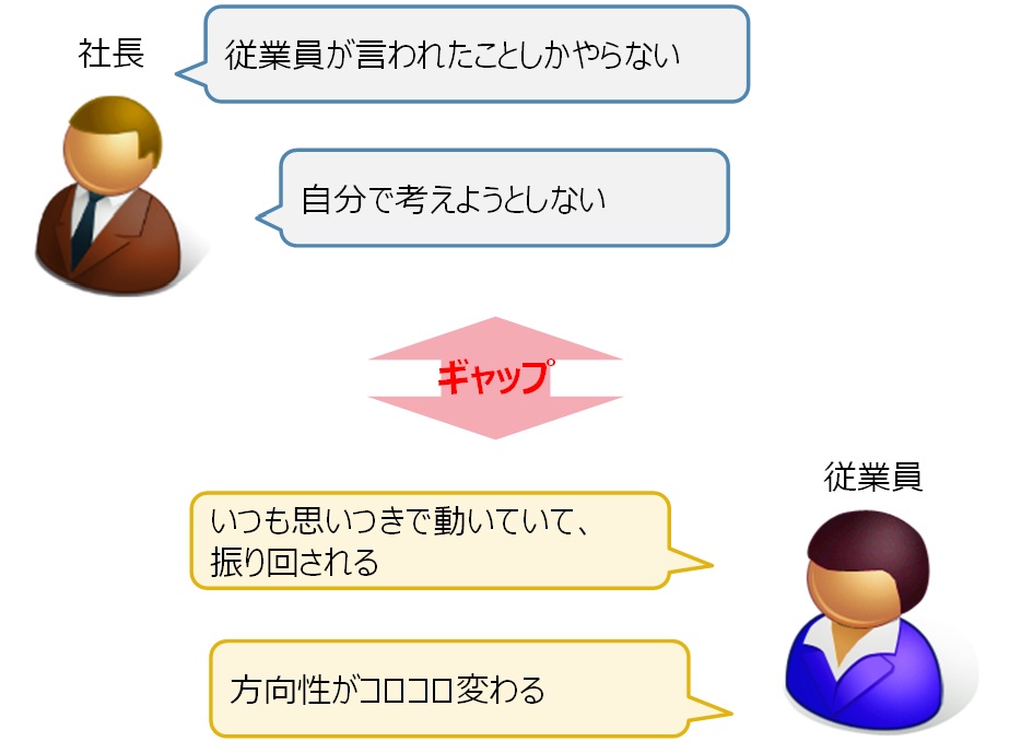 しかし、これを見た従業員は、「社長の言っていることがまた変わった」「結局何がやりたいのか分からない」と戸惑い、結果として「分からないから、とりあえず言われたことだけやっておこう」という姿勢になってしまいます。それを見た社長は「うちの従業員は、言われたことしかやらない」と思うわけです。これでは悪循環です。