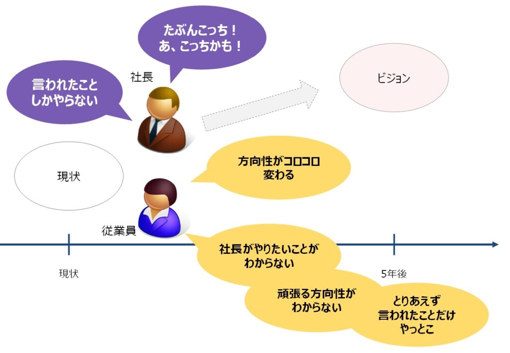 その根本原因は、社長の頭の中にある方向性やイメージが、組織全体で共有されていないことです。